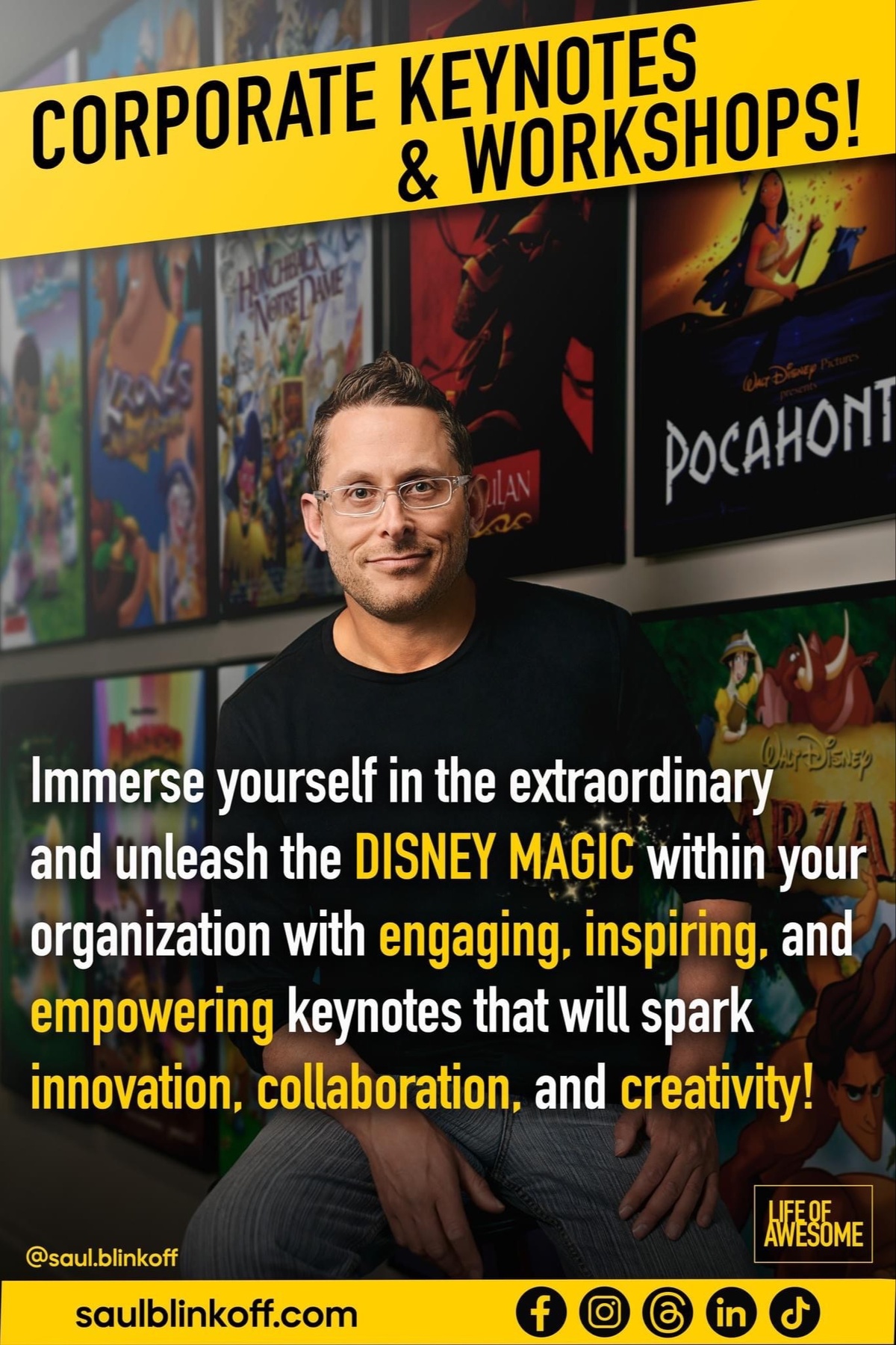 Saul Blinkoff, Disney filmmaker and dynamic keynote speaker, brings Disney magic and powerful storytelling to every stage. His transformative talks inspire audiences to dream big, lead with purpose, and tap into their limitless creative potential—leaving them empowered, energized, and ready to live a meaningful, awesome life.